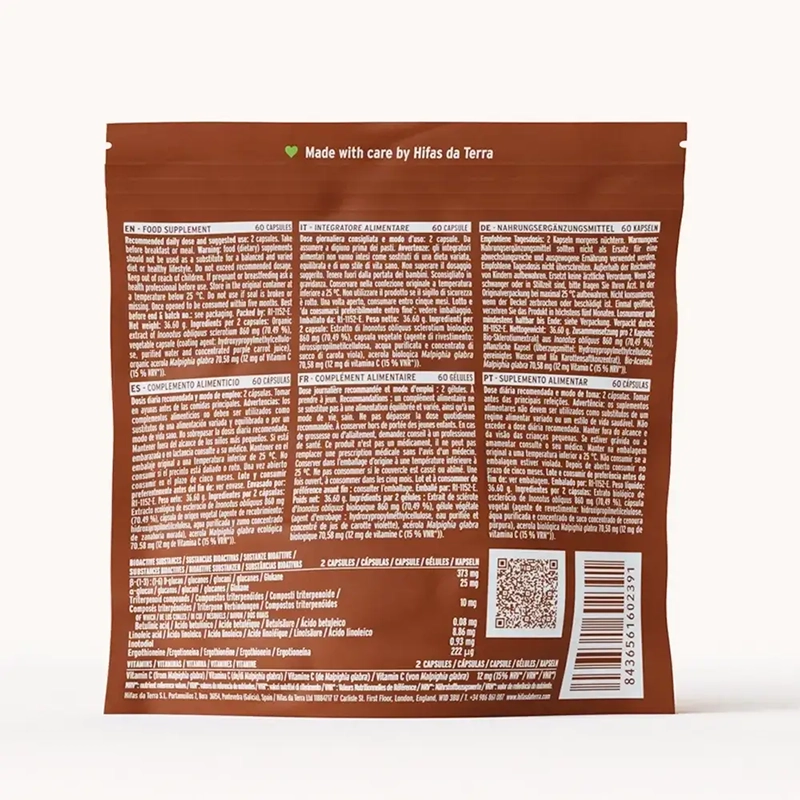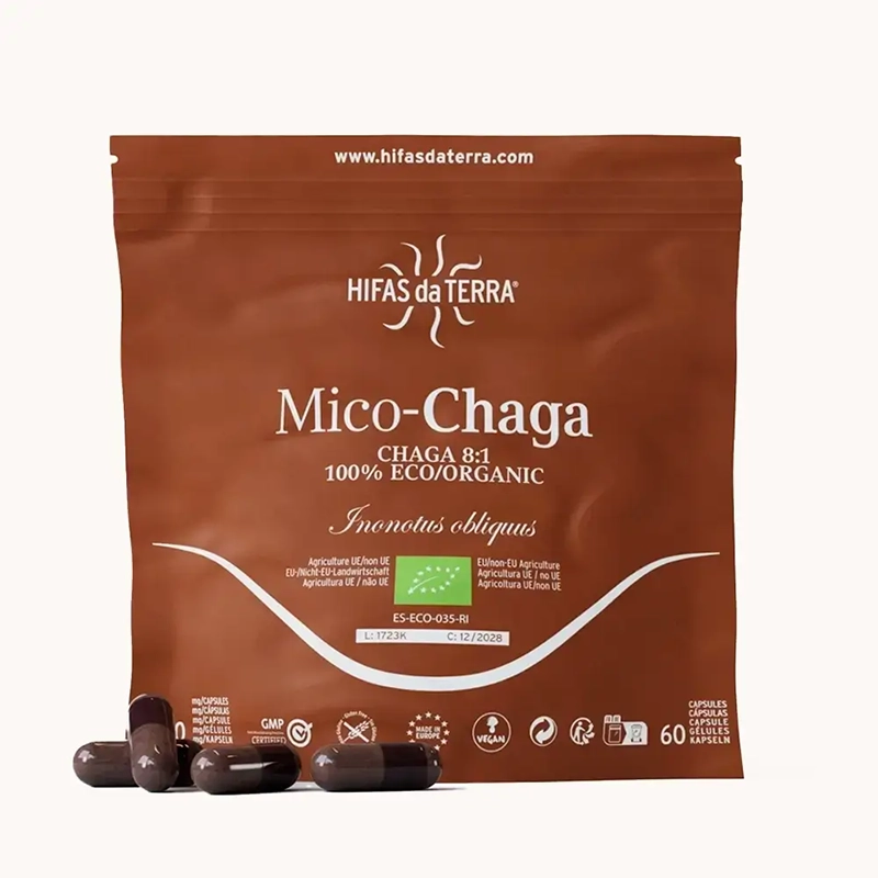 En choisissant le laboratoire Hifas Da Terra, vous avez l'assurance d'un produit de qualité maximale avec la quantité précise de substances bioactives. Seul Hifas da Terra à un dosage précis sur l'extrait de champignon concentré CHAGA avec plus de 40% de bêta-glucanes fongiques β-(1-3),(1-6), D-glucanes, ses triterpènes, l’ergothionéine, entre autres. En outre, deux autres puissants ingrédients actifs spécifiques se retrouvent dans le Chaga, l’acide bétulinique et l’inotodiol, qui indiquent que vous êtes en présence d’un Chaga biologique de première qualité.