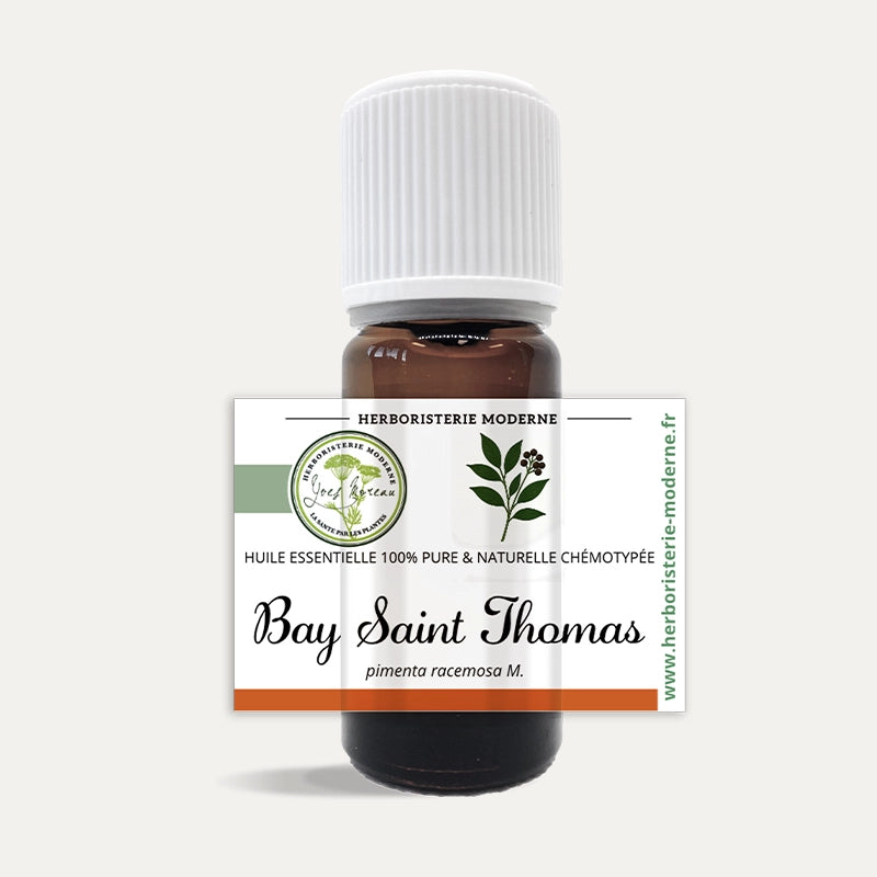 L’huile essentielle de Bay de Saint-Thomas est extraite des feuilles du Pimenta racemosa, un petit arbre tropical de la famille des Myrtacées, originaire des régions chaudes. Distillée à la vapeur d’eau, cette huile révèle un parfum chaud, boisé et légèrement épicé, caractéristique de ses feuilles aromatiques.