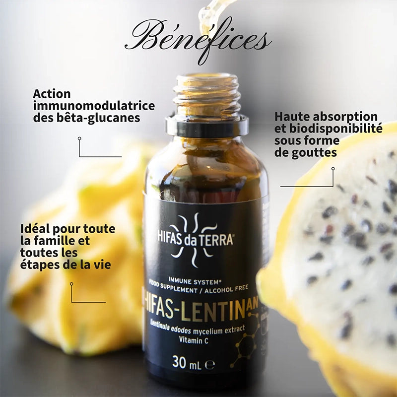 HIFAS-Lentinan est un complément alimentaire liquide puissant conçu pour soutenir votre système immunitaire. Ce produit de qualité supérieure est formulé à partir de Lentizumib®, un bêta-glucane actif et concentré dérivé du Shiitake (Lentinula edodes), un champignon reconnu pour ses bienfaits immunitaires. HIFAS-Lentinan est également enrichi en vitamine C naturelle pour maximiser son efficacité.