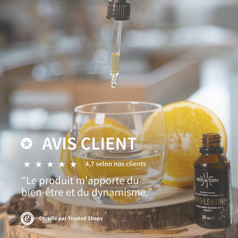 Le complément HIFAS-Lentinan libère du Lentizumib®, un lentinan de type bêta-glucane hautement concentré, immunologiquement actif et soluble. La vitamine C intégrée dans la formule complète l’action du lentinan, renforçant ses effets et améliorant sa biodisponibilité.