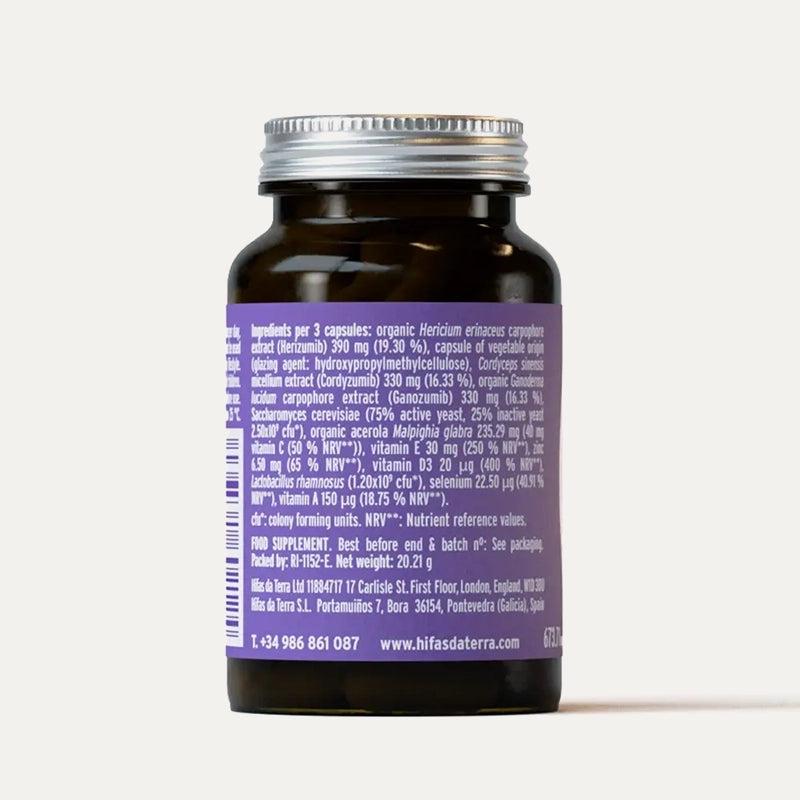 - Complément alimentaire à base de champignons fonctionnels, vitamines, minéraux et probiotiques