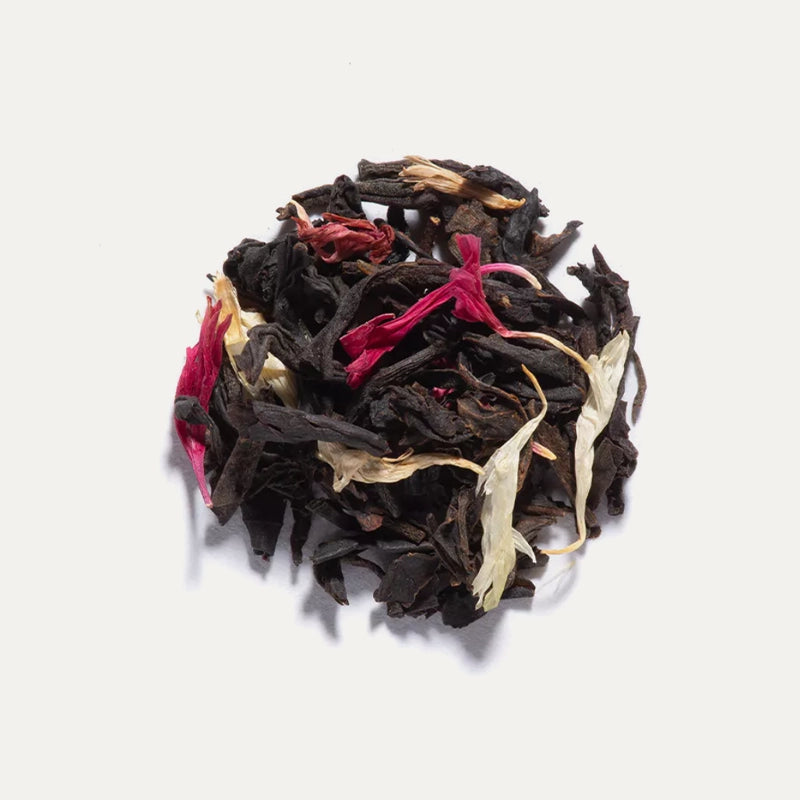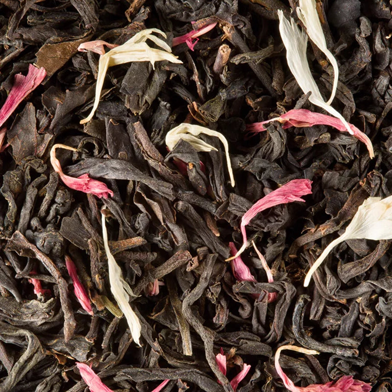 Thé noir aromatisé : Thé noir, arômes (Cerise, pain d'épices, Amande amère) et huile essentielle de Gingembre, pétales de fleur.