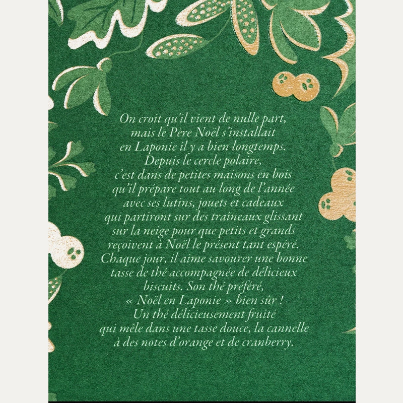 Présenté dans une élégante pochette décorée de feuillages d’hiver, ce coffret renferme 6 sachets de Thé vert subtilement épicé et fruité, où se mêlent les arômes chaleureux de Cannelle, la fraîcheur de l’Orange et la douceur acidulée de la Cranberry.