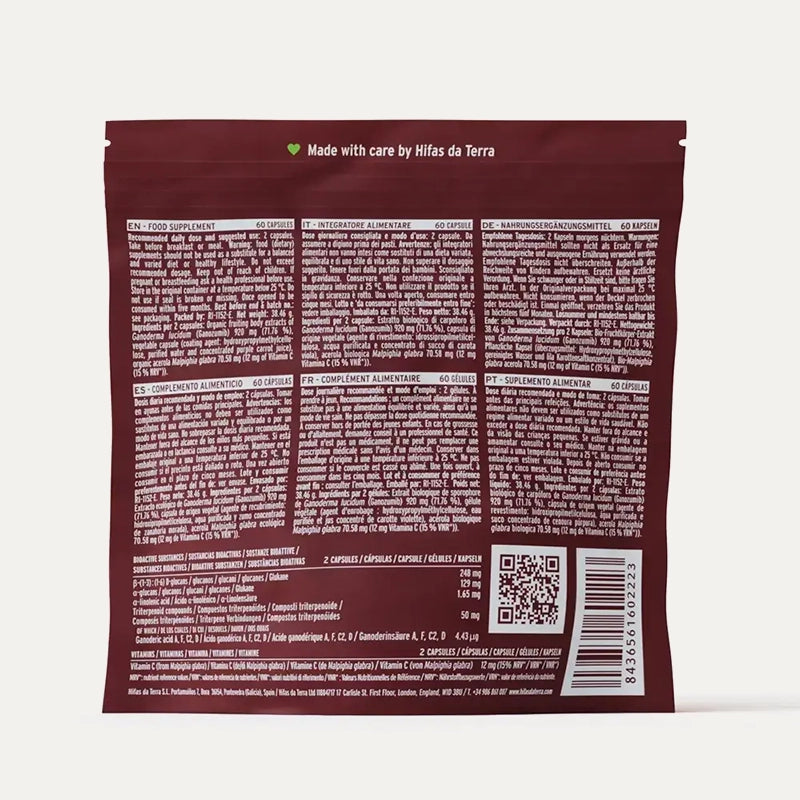 Cette culture en milieu naturel permet une forte concentration d'actifs, tels que polysaccharides, Bêta Glucanes, glucides complexes qui activent la réponse immunitaire et augmentent l'activité des cellules NK (Natural Killer). Le champignon Reishi Bio Ganoderma Hifas da Terra stimule le système immunitaire, aide à lutter contre la fatigue, la faiblesse et les symptômes lié à l'anxiété, à l'irritabilité et au stress.
