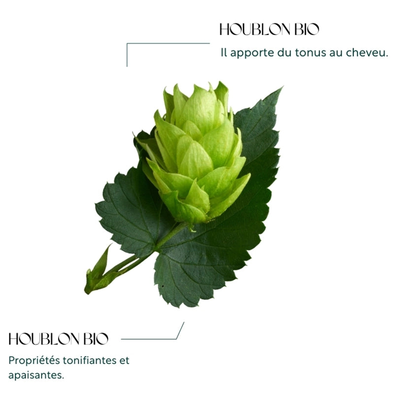 - Le Houblon et la protéine de soja gainent et renforcent les cheveux en douceur.