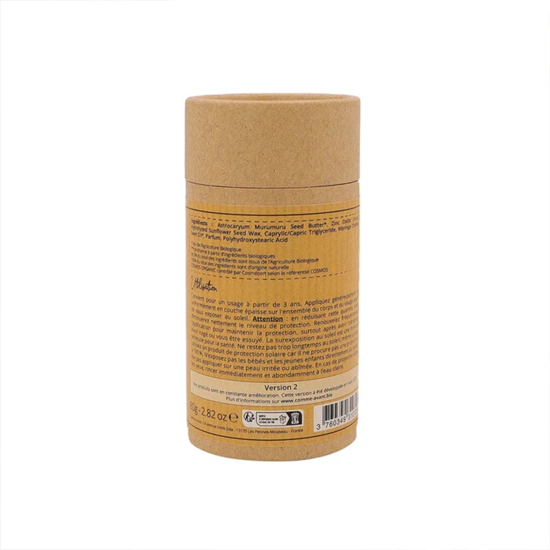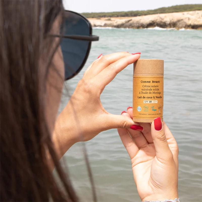 Cette crème solaire SPF30 solide minérale à l'huile de Moringa, est fabriquée dans l'atelier de Comme Avant, près de Marseille.