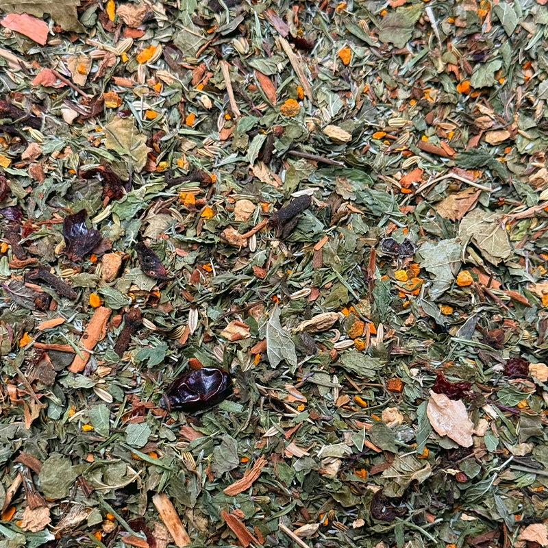 Thym feuilles, Sarriette feuilles, Gingembre rhizome, Curcuma rhizome, Cynorrhodon fruit, Cassis feuilles, Fenouil semences, Menthe douce nanah feuilles, Cannelle de Ceylan écorces, Girofles clous
